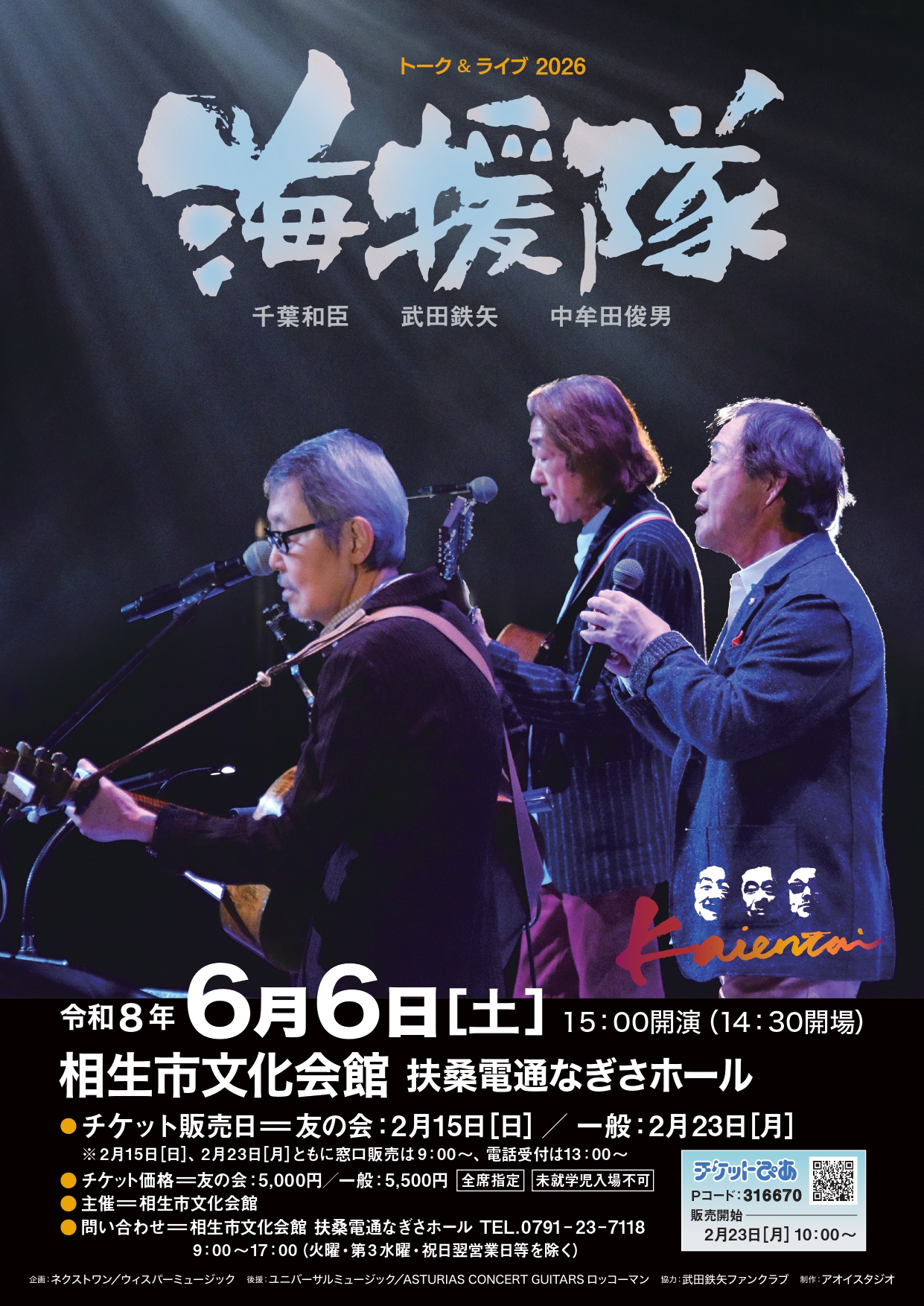 | プレイガイド | 相生市文化会館窓口(9時~17時、火曜・第3水曜・祝日翌営業日除く) TEL:0791-23-7118 チケットぴあ[Pコード:316670]10時~ ※チケットぴあの販売は一般販売のみの取り扱いとなります。 |